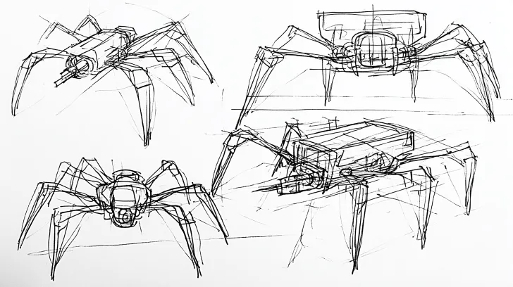 Midjourney Bot 更新时间:2026-03-17 00:01工业设计手绘推导草图版面,纯黑白线稿,白色背景配黑色流畅且有粗细变化的线条,无阴影、无色彩、无渲染,完全模仿参考图的作品集草图风格;内容为从蜘蛛生物形态到四旋翼施肥无人机的造型推演:上方区域是蜘蛛形态提取小稿(提取八足外张姿态、节肢关节结构、低趴俯冲感、口器刺入特征),中部区域是生物结构抽象转译草图(将八足简化为四旋翼机臂 / 支撑腿、躯干转化为扁平厚实机身、口器提炼为底部功能模块),下方区域是最终无人机造型草图(匹配产品特征:前低后高的厚实机身、前置摄像头模组、四个细长镂空机臂与旋翼、底部悬挂机械钻头模块);画面需包含推导箭头、多角度视图、局部结构草图、透视辅助线,保留设计过程修改痕迹,主次分明,呈现专业工业设计学生作品集推导页质感,无文字、无场景、无多余装饰。 --ar 16:9 --v 7 --stylize 14 --sref https://images.gogpt.vip/aigf/m_origin/20260317/2036350/q2csrxlp2hg1xbi1.jpg --sw 615