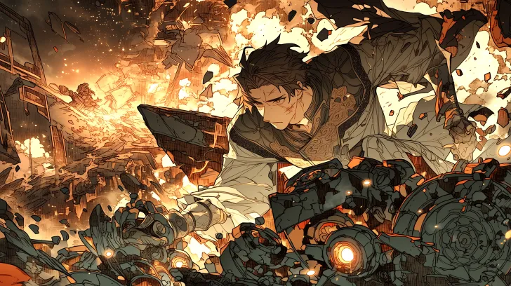 Midjourney Bot 更新时间:2026-03-17 00:01medium shot 中景,国漫紧张氛围感分镜,16:9 画幅,国风玄幻修仙漫画风格,28 岁眉目沉稳、气质坚毅的傀儡大宗师男主,墨发半挽,身着玄灰镶铜纹劲装,周身萦绕着金属光泽的傀儡灵力,张开双臂将受伤的师弟师妹护在身下,身前本命木质傀儡展开巨大的机关盾,硬抗工坊坍塌坠落的巨石与爆炸的火光,对面偷袭的黑衣邪修正祭出法宝准备二次攻击,背景是火光冲天的宗门傀儡工坊,散落的机关零件,断裂的木质傀儡残骸,飞溅的火星,暖红爆炸火光与冷铜色机关光影对冲,强守护氛围感,细腻国风线稿,水墨厚涂质感,极致细节,2K 画质 --ar 16:9 --stylize 220 --niji 7