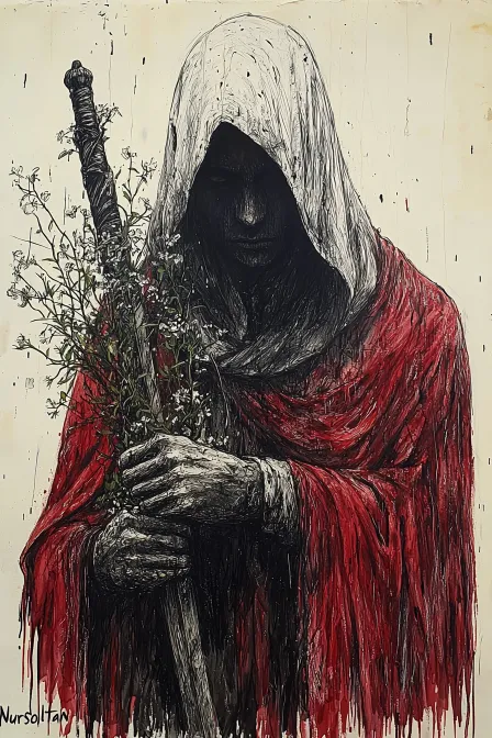Midjourney Bot 更新时间:2026-03-17 00:01纯手绘红黑白,斗篷剑,精神病视角,抑郁症视角,七宗罪,压抑。“Nursoltan” --ar 2:3 --v 6.1 --c 88 --quality 2 --stylize 724 --sref https://images.gogpt.vip/aigf/m_origin/20241019/227911/agacp5hsqqhwjefv.jpeg --sw 79