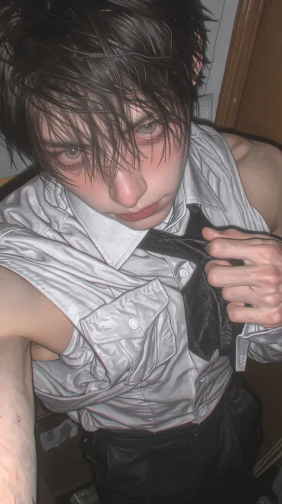 Midjourney Bot 更新时间:2026-03-17 00:09BJD艺术风格,二次元人物 ,远景全身,动漫拟真,油画笔触,视角为第一人称,目光直视观者,角色为一名男人,胸肌发达,冷白偏麦色肌肤, 清晰胸肌与腹肌线条利落, 短发利落有型。身着白衬衫半褪至臂弯, 黑色领带松垮垂在胸前, 袖口微卷。单手抬至胸前, 指尖轻扯领带, 身体微侧,,站姿,眼神直视镜头,强烈对比色,微微低头,直视观者,室内背景,冷漠的眼神,年轻帅哥,,以单人视角为主,具有半写实特征,采用半写实风格,风格类似 genkiheiki,绘画风格为素描线条,作品为彩色素描,角色来自电子游戏,具有半写实感,采用 3D 渲染技术,虚拟形象,虚拟哥特风格,IMVU 风格,细节丰富,妆容精致,带有撒娇意味, --ar 9:16 --c 7 --stylize 777 --niji 7 --profile gjyypr5