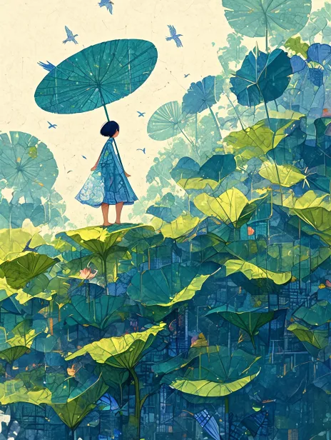 Midjourney Bot 更新时间:2026-03-17 00:10夏日场景,天空飘着细雨,一位少女行走在荷叶之上,四周是线条感的绿色树林,天空中有燕子飞舞,画面前方柳枝轻拂。 插画采用彩色线条扁平化风格绘制,以黄绿色为主色调,构图为俯视视角,从天空向下俯瞰。,64K --ar 3:4 --stylize 1000 --niji 6