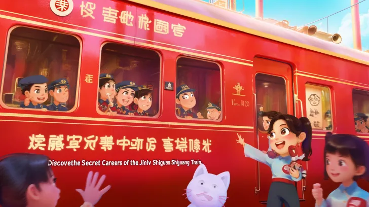 Midjourney Bot 更新时间:2026-03-15 00:16https://images.gogpt.vip/aigf/m_origin/20260314/253643/r9ax8xwlx9nmjwpr.jpg 一辆鲜艳的红色列车停在车站,车身上有醒目的金色字体,描绘着“津旅时光号列车小职员职业探秘”。车窗里透出温馨的场景,几位乘客正与孩子们互动。前景中,几个可爱的孩子兴奋地朝列车挥手,表现出浓厚的好奇心和期待感。旁边是一只卡通形象的小猫,手持扩音器,仿佛在热情地宣传什么。整体画面色彩鲜明,充满了欢快的氛围,展现出一种温馨且充满童趣的场景。整个画面是色彩浓郁、温馨惬意的插画风格 --ar 16:9 --stylize 100 --iw 2 --niji 6