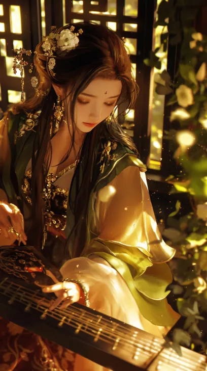 Midjourney Bot 更新时间:2026-03-15 00:17一位美丽的女子,一条面巾遮住下半张脸,正在弹古筝,古风房间背景,成熟稳重,古风长发,古风汉服,纱裙,舞裙,肤色白皙,神情忧郁,颇具魅力,古风长发,华丽额饰发饰,金色细链装饰,下颌线条分明,淡粉色嘴唇,眉形精致,整体氛围既内敛又充满张力,眼神深邃,表情狂放而冷酷,面部立体感强,深邃而迷人,带有领袖气质,成熟稳重,嘴唇呈 M 形,气质桀骜俊朗,散发危险气息,动态姿态,日光洒入室内,柔和光线洒入室内,光影细腻,阴影对比强烈,伪厚涂画法,半写实风格插图。 --ar 9:16 --style raw --stylize 100 --niji 6 --profile 588jlqf stfbdsp nroqu1n