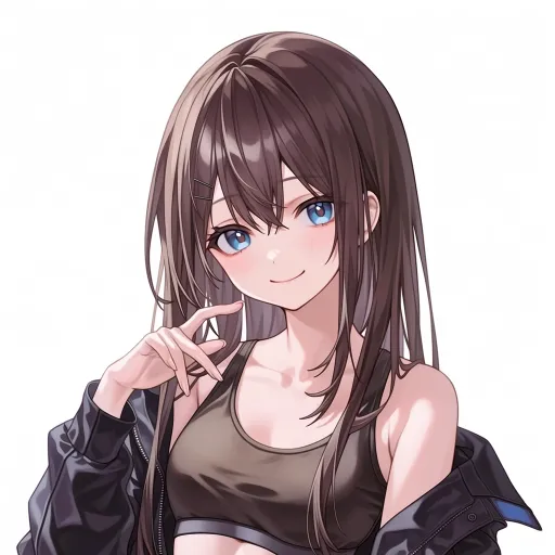 Midjourney Bot 更新时间:2026-03-15 00:20女生,棕色中长发,自然披着直发,蓝色眼睛,甜酷风格,吊带露脐背心,冲锋衣外套,灵动的样子,一个小发夹,头像,胸像,日漫二次元风格,微笑,灵动的样子,摆着灵动的pose,白色背景 --ar 1:1 --niji 7