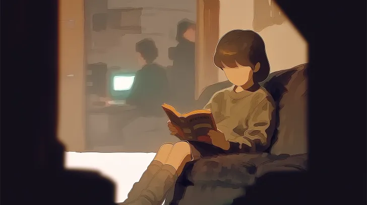 Midjourney Bot 更新时间:2026-03-15 00:20https://images.gogpt.vip/aigf/m_origin/20260315/2084038/aoujqioq5ra0s9f6.png 一个孤独的小孩坐在舒适的沙发上,孩子手中捧着一本欧亨利的书籍阅读着,背景隐约可见哥哥的房间门缝透出台式电脑的光芒,另一边父母的工作场景被模糊处理在远处。绘本风格插图,柔和的灯光照亮房间,温馨的怀旧氛围。Octane渲染,高细节,浅景深,电影视角。模仿莫里斯·桑达克的儿童绘本艺术风格。人物没有人脸,哥哥年龄在十岁左右 --ar 16:9 --stylize 100 --niji 7
