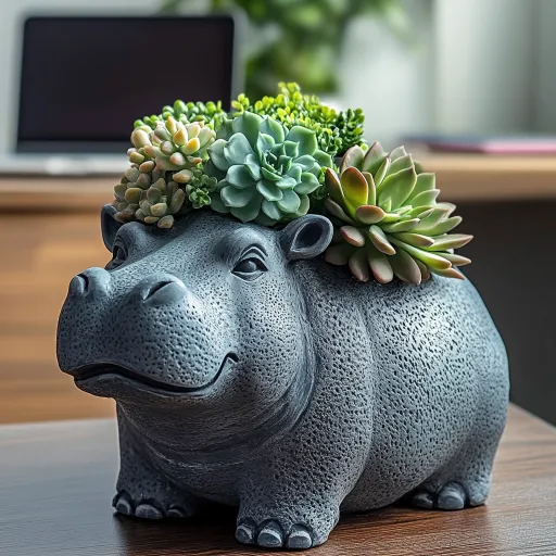 Midjourney Bot 更新时间:2026-03-16 00:00一款河马蹲坐在地上造型的花盆,花盆里种植着多肉植物,河马的皮肤光滑清晰可见,背景是书桌旁边还有一台笔记本电脑和钢笔。 --ar 1:1 --v 6.1