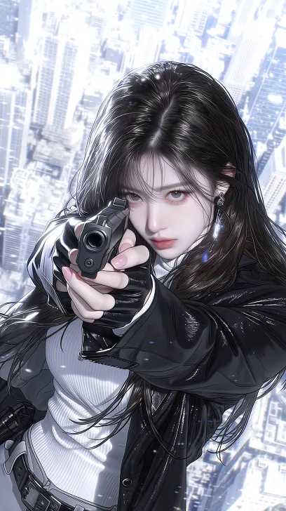 Midjourney Bot 更新时间:2026-03-16 00:01女生,特工,严肃,黑色头发,低丸子头,黑色外套,白色内搭,拿着枪,眼神严肃,繁华城市背景,美丽,大方,拿着枪,微侧脸,准备袭击,动作利落,清晰, --ar 9:16 --stylize 200 --niji 7 --profile c4y4k3w 3vdzyo3 z1g3p5p jenkakd zaad75g --no 露牙齿