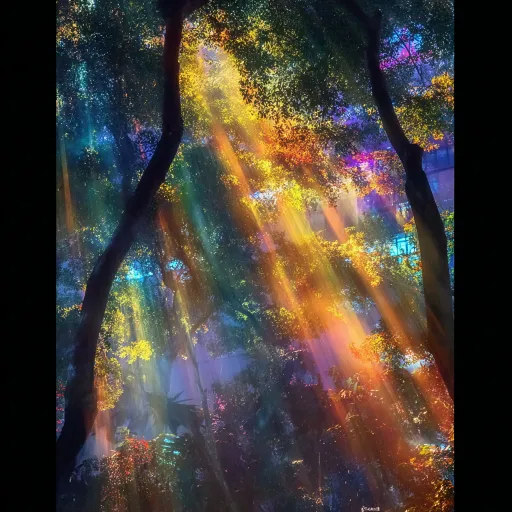 Midjourney Bot 更新时间:2026-03-16 00:02https://images.gogpt.vip/aigf/m_origin/20260315/380525/5zdkbjju0fe3m8dx.jpg https://images.gogpt.vip/aigf/m_origin/20260315/380525/q0v18hwnu8akr7v4.jpg https://images.gogpt.vip/aigf/m_origin/20260315/380525/flvwkpcixend2cir.jpg https://images.gogpt.vip/aigf/m_origin/20260315/380525/lyhy3z1rs7nc8rbd.jpg 色彩斑斓的丁达尔光线穿透树叶,形成多彩的光束,照耀在树干和树冠上。画面中有深色的树干与繁茂的绿色树叶,色彩呈现出橙色、黄色、蓝色和紫色的渐变,营造出梦幻般的氛围。背景模糊,整体画面具有神秘且魔幻的感觉,透出自然与城市交融的和谐美。 --ar 1:1 --v 7 --stylize 100 --iw 2