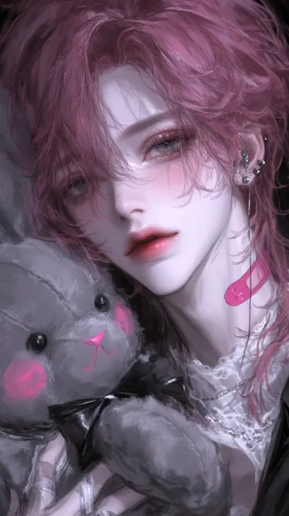 Midjourney Bot 更新时间:2026-03-16 00:03俯视,厚涂,男,主播。浅粉色头发,M型刘海,毛流感,成男,28岁,甜甜的感觉,抱着兔子玩偶,有点委屈,把脸贴在玩偶上,雾面,脖子系着绷带,穿着白色蕾丝v领短袖,脖子上带着粉色耳机,只有一个耳机,半蹲在地上 --ar 9:16 --stylize 1000 --niji 6 --profile fdq2htn