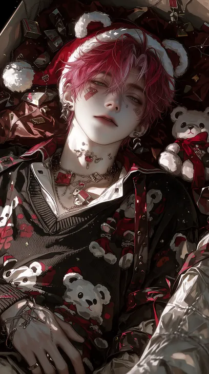 Midjourney Bot 更新时间:2026-03-16 00:03氛围感帅哥,红色长发,蓬松柔顺,额前碎发,浅色眼眸,眉眼清俊,病娇感 衣着:红白色圣诞帽+黑红色小熊图案毛衣(V领设计+宽松)+圣诞元素的耳斯+圣诞元素项圈+圣诞元素手链+躺在大大的礼物盒里,抱着圣诞小熊玩偶+周围圣诞元素物品装饰 风格:伪厚涂cg风格,拟真面容,bjd面容风格,油画感,清冷氛围,最高画质,极致氛围感,自然光,细节刻画,看镜头,High angle (俯视),Full Length Shot(FLS) --ar 9:16 --stylize 734 --niji 7