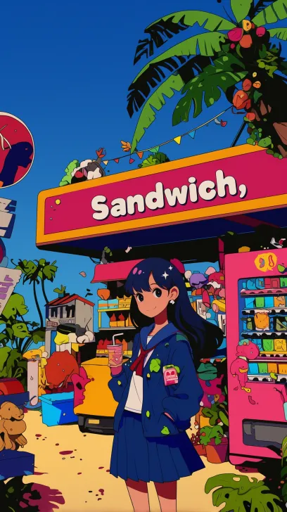 插画风格,充满活力的街头场景,有一家标有 “Fruit Sandwich” 的店铺,旁边有自动售货机,还有穿着校服的女孩和小狗等元素,色彩鲜艳,充满青春与童趣。 --ar 9:16 --stylize 1000 --niji 6 --sref https://images.gogpt.vip/aigf/m_origin/20250902/1794709/0q8b62o5jh9bg7h2.jpg --sw 1000