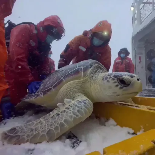 On a Chinese research vessel in Antarctica, Chinese researchers are treating a giant 6-foot sea turtle. This is a screenshot from a TikTok video posted on Reddit in 2019, taken with a mobile phone camera. --ar 1:1 --v 7 --stylize 100