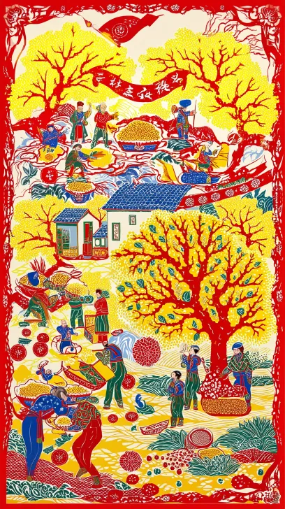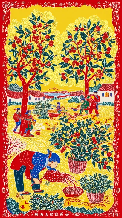 Midjourney Bot 更新时间:2026-03-12 00:19中国民间彩色剪贴画,分色剪纸风格,满构图,高饱和度红黄绿蓝平涂色彩,前景是农家妇女(身着蓝布碎花衫,头扎蓝布巾)弯腰挖野菜,在田里播种,临沂农民在田间小路,挑担、推车,春耕往来,以及临沂农民在家摊煎饼。中景是程式化的榆钱满枝、新柳抽芽,背景是沂蒙农家小院,土墙青瓦,门前杏花再往后是黄色油菜花金黄遍野以及远山含翠,沂蒙农家小院,土墙青瓦,门前杏花人物造型质朴夸张,植物纹样装饰化,整体氛围喜庆热闹,充满乡土生活气息,非遗剪纸艺术。以树为连接,榆钱树为背景 人物是多彩的,背景花边可以参考用统一色系淡绿色,人物呈现清晰一些 --ar 9:16 --v 7 --stylize 100 --sref https://images.gogpt.vip/aigf/m_origin/20260312/1897126/b6nuud9zv8jcr1z1.jpg --oref https://images.gogpt.vip/aigf/m_origin/20260312/1897126/b6nuud9zv8jcr1z1.jpg --ow 0 --sw 358