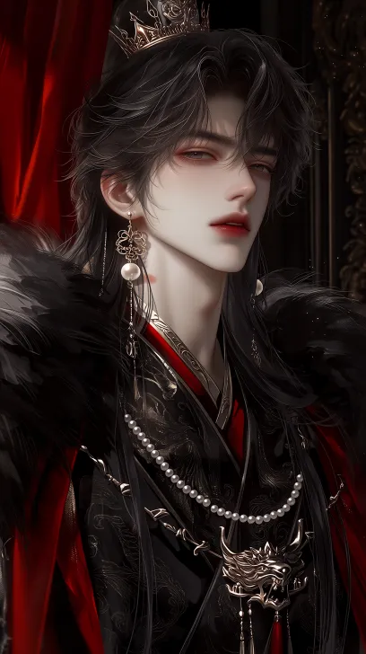 Midjourney Bot 更新时间:2026-03-12 00:17一位古风俊美男性,看似30岁左右,肌肤白皙,眼尾微挑,唇色是冷调殷红,面部线条锋利冷冽,下颌线棱角分明,高挺鼻梁,薄唇微抿,神情慵懒又带着疏离的矜贵;及腰墨黑长发,发丝蓬松凌乱,头顶戴着暗金色缠枝纹发冠,右耳佩戴镂空缠枝纹金质耳坠,坠有圆润白珍珠,颈部挂灰玉珠串项链,坠着嵌白珠的金质兽首佩饰,服饰为黑红撞色古风长袍,外披玄色狐毛大氅,衣身绣暗金色龙纹,红绸镶边,衣料是暗纹织锦与哑光丝绸质感;背景是暗调古殿内,红绸垂落,鎏金雕纹隐于阴影中,厚涂半写实插画,高细节,8k分辨率,虚幻引擎5渲染风格,高光反射,高贵,精致。 --ar 9:16 --stylize 332 --niji 7 --no 低饱和,文字
