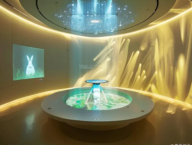 Midjourney Bot 更新时间:2026-03-12 00:21https://images.gogpt.vip/aigf/m_origin/20260311/2082133/873rmbj52d6pdfp5.jpeg 圆形静谧室内空间,四周都是投影幕布,中央是全息投影展台,中央平台被柔和光束照亮,全息投影是小兔子影像,星光牵引效果,空间顶部星光洒落,神圣庄严氛围,唯美梦幻,纯净白色与淡黄色调,细腻光影层次 --ar 4:3 --v 6.0 --style raw --stylize 100
