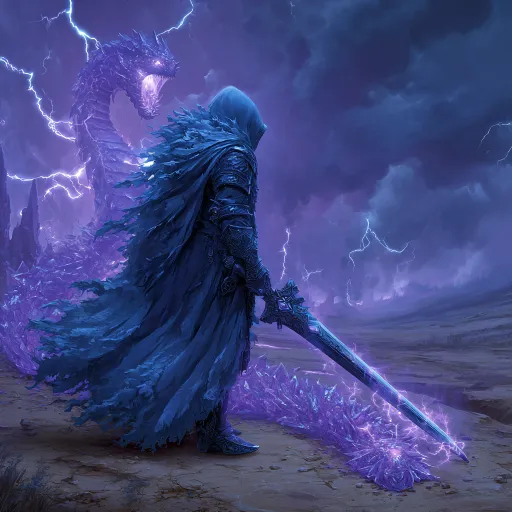 Midjourney Bot 更新时间:2026-03-12 00:02角色:身披蓝紫色羽毛状长袍的战士,手持镶嵌宝石的巨型长剑,袍摆如羽毛般飘逸灵动。 怪物:巨型电属性蛇形生物,身躯由蓝紫色能量与晶体构成,环绕闪电,背景幽暗荒原与闪电云,科幻与奇幻结合的 CG 质感。 --ar 1:1 --v 7 --stylize 100