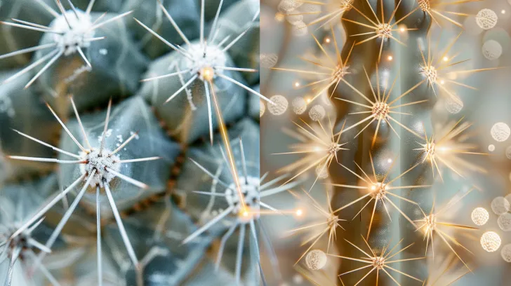 Midjourney Bot 更新时间:2026-03-12 00:06分裂画面,左侧特写仙人掌刺,右侧特写仙人掌茎,中间有光点或线条连接,表示功能协作,背景为中性色,科技感,教育风格,8k分辨率 --ar 16:9 --v 6.0 --stylize 100