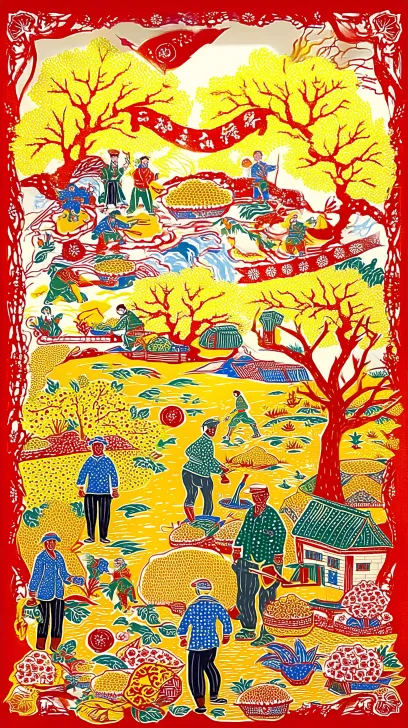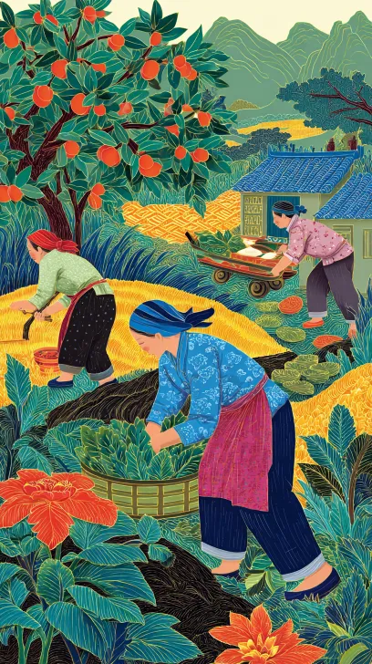 Midjourney Bot 更新时间:2026-03-12 00:12中国民间彩色剪贴画,分色剪纸风格,满构图,高饱和度红黄绿蓝平涂色彩,前景是农家妇女(身着蓝布碎花衫,头扎蓝布巾)弯腰挖野菜,在田里播种,临沂农民在田间小路,挑担、推车,春耕往来,以及临沂农民在家摊煎饼。中景是程式化的榆钱满枝、新柳抽芽,背景是沂蒙农家小院,土墙青瓦,门前杏花再往后是黄色油菜花金黄遍野以及远山含翠,沂蒙农家小院,土墙青瓦,门前杏花人物造型质朴夸张,植物纹样装饰化,整体氛围喜庆热闹,充满乡土生活气息,非遗剪纸艺术。以树为连接,榆钱树为背景 人物是多彩的,背景可以参考用统一色系 --ar 9:16 --v 7 --stylize 100 --sref https://images.gogpt.vip/aigf/m_origin/20260312/1897126/b6nuud9zv8jcr1z1.jpg --oref https://images.gogpt.vip/aigf/m_origin/20260312/1897126/b6nuud9zv8jcr1z1.jpg --ow 442 --sw 358