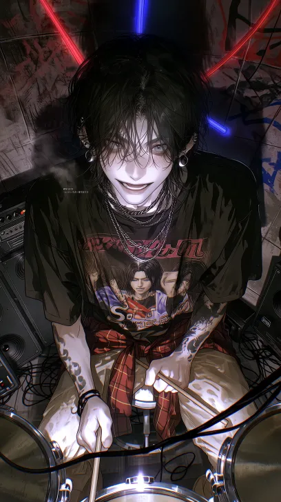 Midjourney Bot 更新时间:2026-03-12 00:09俯拍视角,top-down view,鱼眼镜头,1boy,上半身胸像特写,他坐在凳子上,身体折叠,在打鼓,五官立体精致,眉眼锋利狭长微挑,灰黑色瞳色,长睫毛,高挺鼻梁,薄唇带慵懒坏笑,冷白皮肤,面部线条清晰利落,中分黑长直微湿碎发,发丝有空气感,上身是一件做旧复古摇滚主题黑色短袖T恤,正面印有美式乐队海报风格的人物印花和字母装饰,腰间系了一件红棕格纹衬衫,丰富了造型层次感露出清晰锁骨,颈部多条银色金属链条项链,耳朵黑色耳钉,小臂简约黑色纹身,他坐在凳子上,打鼓,双手持鼓棒,手臂线条利落,姿势松弛拽气,背景为昏暗地下乐队练习室,深色水泥墙面带斑驳做旧涂鸦,角落堆放音箱、效果器与黑色电缆,后方红蓝霓虹灯管交叉打光,空气中轻薄烟雾与浮动尘粒,背景虚化景深,暗黑色调为主,局部霓虹高光,电影感侧光,暗调冷色系,厚涂写实画风,8K超高清,细节拉满, --ar 9:16 --stylize 407 --niji 7 --no 闭眼,