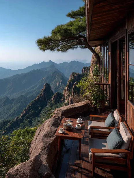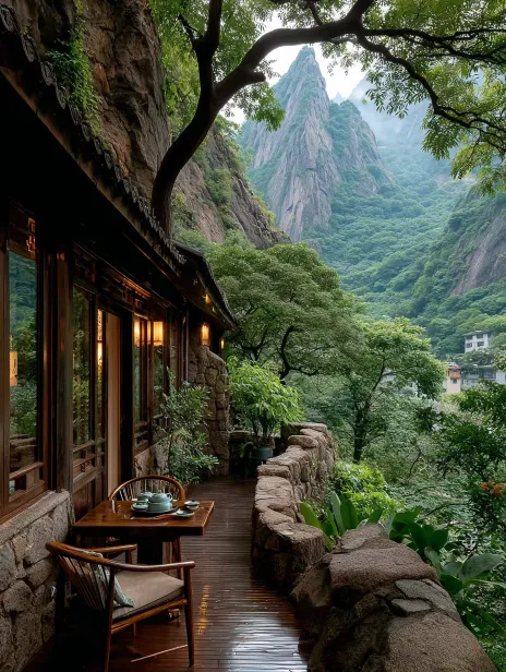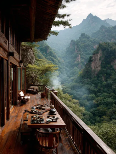 Midjourney Bot 更新时间:2026-03-12 00:09画面中是地处深山里的一处中式木构大宅,在三楼宽敞的阳台走廊上,能看到周围青翠欲滴的山林,远处山峦叠嶂,雾绕青山,如梦如幻的美景,走廊上摆放着休闲的桌椅,桌上燃着香,放着一把古琴和丰富美味的宋氏茶点,晴天,画面明亮,东方意境之美 --ar 3:4 --v 7 --style raw --stylize 100