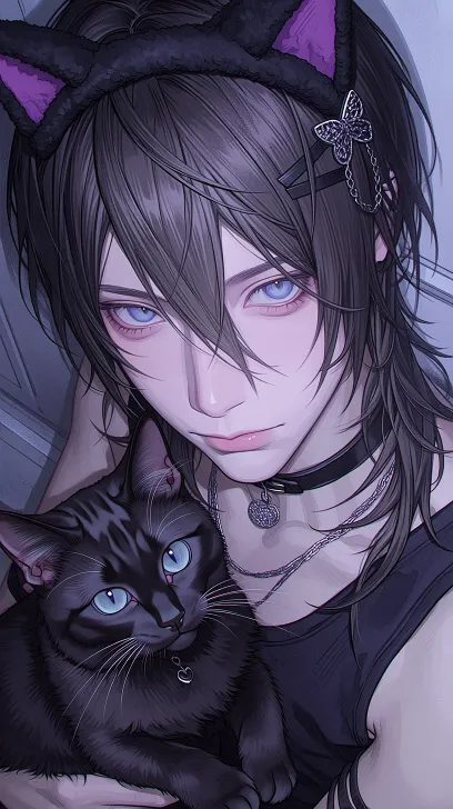 Midjourney Bot 更新时间:2026-03-12 00:10油画质感, 磨砂哑光, 清冷猫系少男 冷白皮透着淡紫柔光, 眼尾晕染粉紫细闪猫系妆容, 唇色柔粉微抿, 黑色长卷发如瀑垂落, 头戴黑色毛绒猫耳发箍, 耳间缀银质蝴蝶结饰件, 颈间系黑色choker配银质吊坠。身着黑色吊带背心, 勾勒纤细肩颈线条。双臂环抱着一只纯黑短毛猫, 猫咪趴在膝头, 蓝绿色眼眸望向侧方, 少男低头温柔注视怀中小猫, 眼神软萌又清冷。背景是浅紫调简约室内, 黑紫白哑光色调, 笔触细腻显发丝与猫毛肌理, 磨砂弱化银饰与choker高光, 清冷猫系氛围感拉满。 --ar 9:16 --stylize 500 --niji 7 --profile jlyz6xu