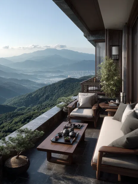Midjourney Bot 更新时间:2026-03-12 00:10画面中是地处深山里的一处中式木构大宅,在三楼宽敞的阳台走廊上,能看到周围青翠欲滴的山林,远处山峦叠嶂,雾绕青山,如梦如幻的美景,走廊上摆放着休闲的桌椅,桌上燃着香,放着一把古琴和丰富美味的宋氏茶点,晴天,画面明亮,东方意境之美 --ar 3:4 --v 7 --style raw --c 20 --stylize 250