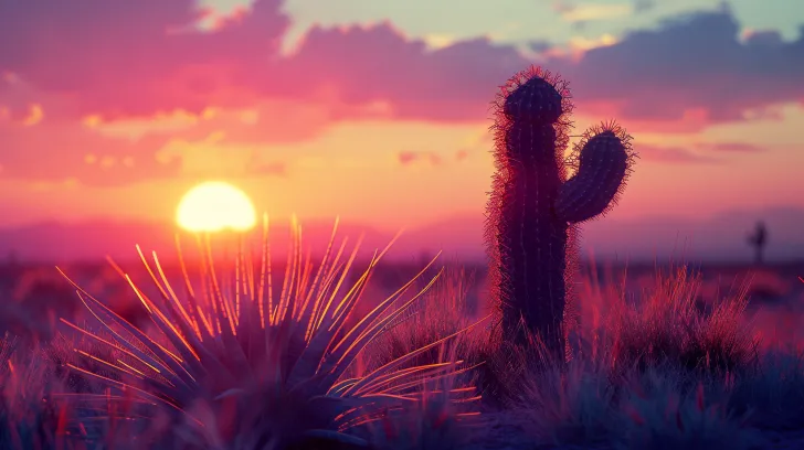 Midjourney Bot 更新时间:2026-03-12 00:14夕阳下的沙漠,一株仙人掌的剪影,刺在逆光中呈现柔和的光晕,天空有绚丽的晚霞,宁静而沉思的氛围,史诗感,8k分辨率 --ar 16:9 --v 6.0 --stylize 100
