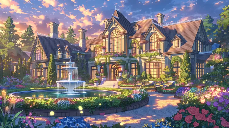 Midjourney Bot 更新时间:2026-03-12 00:14一栋极其华丽的别墅,精美的2D建筑插画,吉卜力工作室与新海诚风格,精致的线条,平面矢量艺术,郁郁葱葱的唯美植物园,优雅的庭院喷泉,发光的萤火虫,日落黄昏的黄金时刻光效,柔和的渐变色彩,梦幻浪漫的氛围,动漫场景级背景,极其详细的细节,最高画质,大师之作 --ar 16:9 --stylize 250 --niji 7