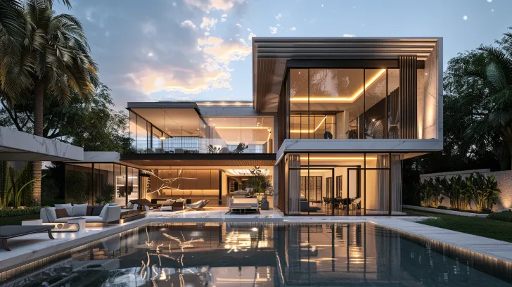 Midjourney Bot 更新时间:2026-03-12 00:14一栋极其华丽的豪华别墅,超逼真的3D建筑表现,Octane渲染器,虚幻引擎5(UE5),具有张力的广角镜头,带落地大玻璃窗的现代优雅设计,高级大理石材质,温暖明亮的室内透光,倒映着黄昏星空的豪华无边际泳池,奢华的热带园林景观,电影级光影,8k分辨率,极致的细节,顶级商业摄影,光线追踪,杰作 --ar 16:9 --v 6.0 --style raw --stylize 150