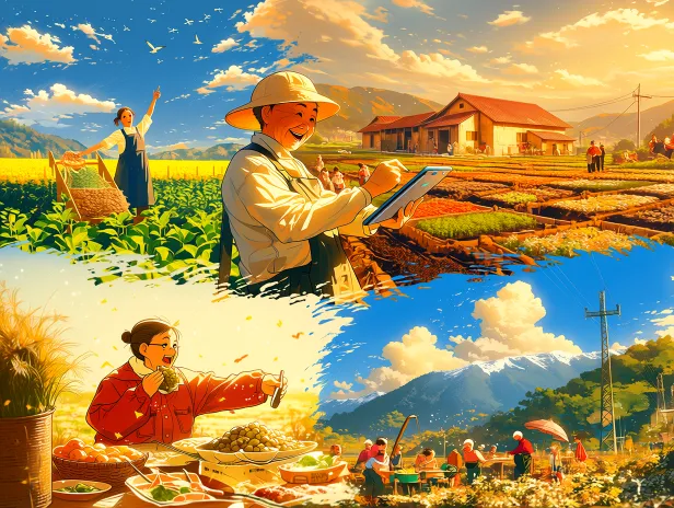 Midjourney Bot 更新时间:2026-03-11 00:04四个分格同时展示: 1.大学生在梯田用平板记录数据 2.老农在合作社交换种子布袋 3.孩子在食堂品尝传统美食(表情惊喜) 4.社区节日,人们跳着舞蹈 --ar 4:3 --stylize 100 --niji 7 --sref https://images.gogpt.vip/aigf/m_origin/20260310/1584630/jw9ezr6qebaqtwyq.png https://images.gogpt.vip/aigf/m_origin/20260310/1584630/n9a0k1go54vgvjzy.png --no 文字