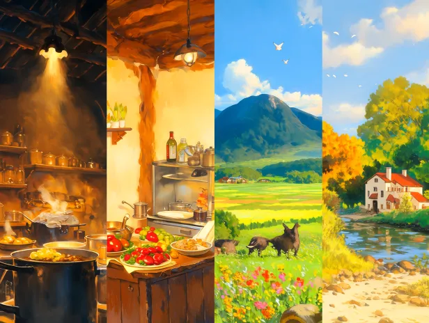 Midjourney Bot 更新时间:2026-03-11 00:06四个分格场景 在学堂讲课、在食堂厨房、节日领舞,农村插秧 --ar 4:3 --stylize 100 --niji 7 --sref https://images.gogpt.vip/aigf/m_origin/20260310/1584630/jw9ezr6qebaqtwyq.png https://images.gogpt.vip/aigf/m_origin/20260310/1584630/n9a0k1go54vgvjzy.png --no 文字