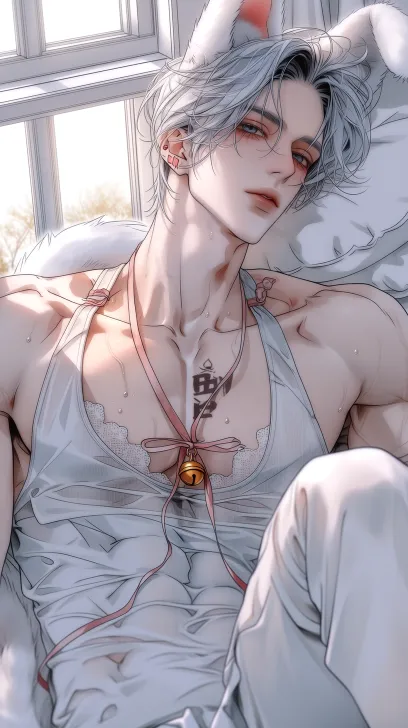 Midjourney Bot 更新时间:2026-03-11 00:09整体画面明亮,梦幻色彩风格,魔幻现实主义,动漫质感绘画,杰作级、超高质量、极致细节,写实渲染,丰富肌理层次,写实半厚涂,BJD精致质感 帅气男性长着白色色猫耳,银灰色短发黑色挑染,冷白皮肤,强壮有力的肌肉身材,胸肌和腹肌的肌肉线条明显,白色丝袜,粉色蕾丝,白色蕾丝,脖子上粉色丝带蝴蝶结有铃铛,身后有尾巴,五官锋利立体,脸颊带有淡淡红晕,皮肤带汗湿质感,粉色小耳夹,清晰锁骨,精致纹身,高清画质。 半身照,躺在柔软垫子上,大腿以上镜头构图。 窗外阳光照射进来,冷色光,光线柔和的戏剧化光线,通透光泽画面清晰,光影弥散,色彩绚丽,慵懒空灵的情绪,梦幻浪漫氛围,珠光感,治愈感,软光效果,高清,8k分辨率 --zoom 1.5 --ar 9:16 --stylize 100 --niji 7 --profile gewsf5e 7wa9zk3 --no Look