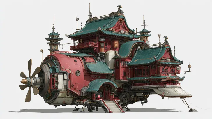 Midjourney Bot 更新时间:2026-03-11 00:103A游戏级单体建筑概念设计,中式古风与蒸汽朋克机械融合的浮空工坊,核心为巨型螺旋桨引擎与中式飞檐楼阁拼接;深绿瓦顶、红木梁柱、斗拱飞檐与金属管道、齿轮、螺旋桨、玻璃舱体精密结合;等轴测45°俯视构图,纯白圆形背景,干净简洁;模块化拼接结构,机械传动细节丰富,金属与木质材质对比强烈;写实渲染,Blender建模质感,8K超高清,线条硬朗,细节极致,东方赛博朋克美学,科技与古韵碰撞 --ar 16:9 --v 7 --stylize 100