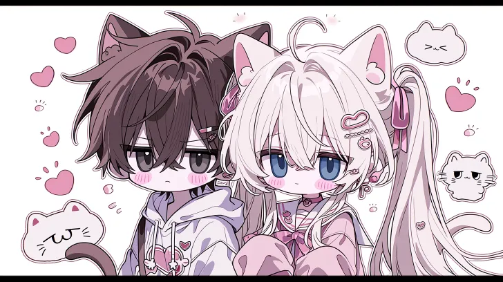 Midjourney Bot 更新时间:2026-03-10 00:08一幅活泼的动漫风格插画,灵感源自BJD球形关节人偶,中景镜头下呈现两个Q版角色,一位戴着猫耳的短发男孩,生气的表情,一位留着长发、戴着同款猫耳的女孩,白色的头发,粉色的衣服,点缀着粉色爱心细节与可爱的猫咪造型设计,整体氛围俏皮、时尚、轻松,传递出温柔甜蜜的, --ar 16:9 --stylize 1000 --niji 7 --sref https://images.gogpt.vip/aigf/m_origin/20260309/2019047/io81vozo1qg3ojik.png --sw 60 --no 帽子,张嘴
