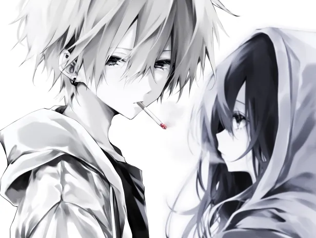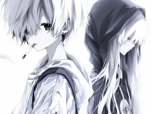 Midjourney Bot 更新时间:2026-03-10 00:09一个动漫男头叼着烟看着一个长发卫衣女孩,忧郁风,白色背景,线条,黑色眼睛,少年,英俊帅气,帅哥,纯白色头发,白色背景,白色外套,连帽衣,白色头发,长袖,看着镜头,飘逸的头发,侧面,转头,短发,上半身, --ar 4:3 --style raw --stylize 488 --niji 6 --profile s4n114l --no 双色头发 头发颜色一半一半的 白发