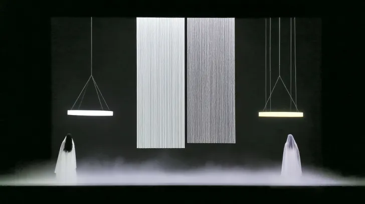 Midjourney Bot 更新时间:2026-03-10 00:09舞台美术设计,极简主义,高级感,色彩均衡,抽象派风格 核心视觉:线性结构(垂直线、网格线、发光轮廓线)为主体,极简舞台,半透明纱幕与干冰烟雾,水平光带切割空间,黑白灰主色调,人物剪影,静谧戏剧氛围,留白构图,线性垂帘,弱对比柔和光影 色彩:冷暖配色 低饱和度高级色调,避免杂乱色彩 光影:舞台侧光/顶光塑造空间层次,明暗对比强烈,突出舞台与纵深感 氛围:现代、先锋、戏剧感,留白充足,构图干净利落,无多余装饰 构成主义、蒙德里安,结合当代剧场装置艺术 16K质量,高分辨率,抽象主义,极简主义, --ar 16:9 --v 7 --style raw --c 23 --weird 485 --stylize 422