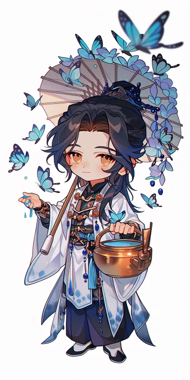Midjourney Bot 更新时间:2026-03-09 00:02吉卜力卡通风格,画师少年,白皙皮肤,杏眼温柔,乌黑长发青玉簪绾起,月白长袍浅青短褂,腰挂青铜香炉和画轴,手指沾颜料。身旁环绕一群彩蝶翅膀组成的伞,流光溢彩。纯色背景,8K,三维渲染。 --ar 1:2 --stylize 100 --niji 7