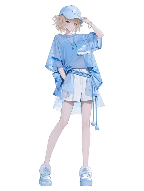 Midjourney Bot 更新时间:2026-03-09 00:03一位可爱的金发少女全身展示,纯白色背景,夏日日常休闲服装设计,以雾霾蓝色系为主,复杂有设计感,少女有着蓬松的金色短发,发尾微卷,头上戴着一顶浅蓝色棒球帽,帽檐有白色刺绣小花图案,身穿宽松的雾霾蓝色短袖衬衫,衬衫面料是轻薄棉麻材质,有透明感,衬衫是oversize版型,袖子卷起到手肘,领口敞开露出锁骨,衬衫下摆前面随意塞进裤腰,后面自然垂落,衬衫胸前有一个立体贴袋,袋口有白色蕾丝边装饰,衬衫背后有蓝色渐变印花图案(隐约可见的云朵形状),下身搭配白色高腰短裤,裤腿宽松A字型,裤脚有毛边和雾霾蓝色刺绣线条装饰,裤腿两侧有透明的蓝色薄纱拼接,腰间系着一条细的蓝色编织腰带,腰带末端垂着两个小毛球,脚穿浅蓝色厚底老爹鞋,鞋带是白色,鞋面上有小花朵装饰,脖子上戴着一条细的银色项链,吊坠是一颗蓝色小珠子,人物呈现单手叉腰的俏皮站立姿态,另一只手自然抬起整理帽檐,身体微微倾斜,双脚一前一后,金发随着动作轻轻晃动,眼神灵动可爱,服装设计细节丰富,层次感强,清新雾霾蓝调,白色背景,全身展示 --ar 3:4 --stylize 100 --niji 7