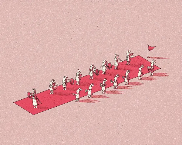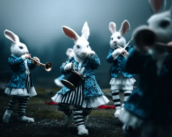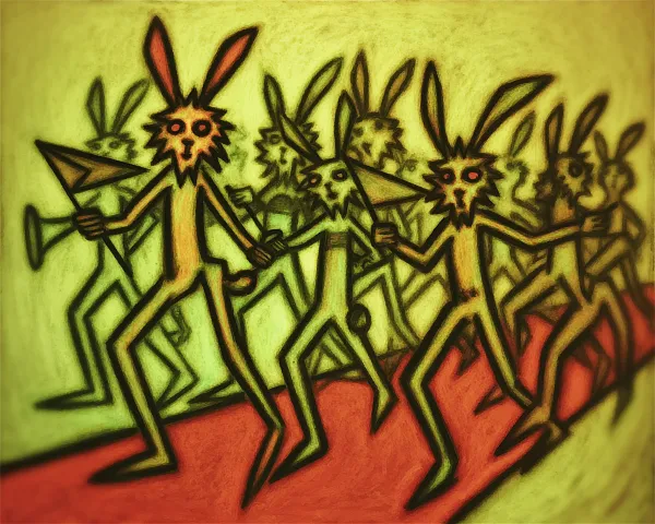 Midjourney Bot 更新时间:2026-03-09 00:09风格:怪诞风格 构图:中心构图 色调:整体为低饱和色调为主,加以高饱和色点缀突出整幅图怪诞氛围 图片类型:彩色丙烯画 兔子要队伍整齐,排头的第一只兔子要举一个小旗帜,后面的兔子要吹拉弹唱,这些兔子是一个仪仗队,脚下踩的红毯要顺着他们前行的方向铺垫 整体弥漫着怪诞荒谬又充满阳光的氛围 --ar 5:4 --v 7 --c 100 --weird 3000 --stylize 1000 --no 黑暗恐怖阴暗诡异氛围