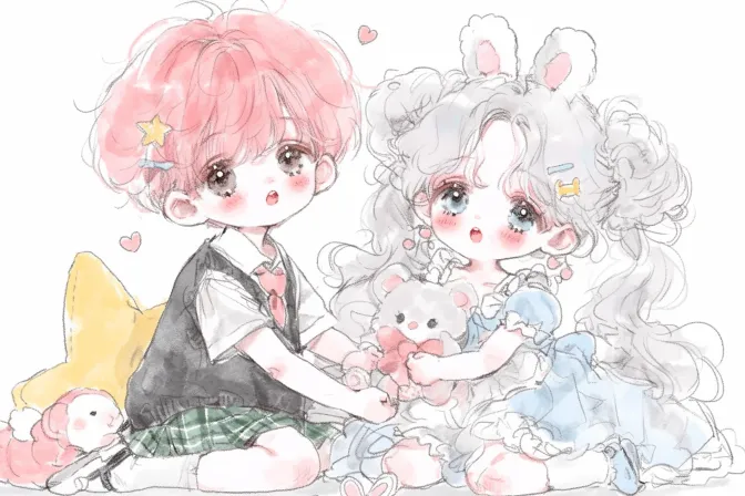 Midjourney Bot 更新时间:2026-03-09 00:04一幅可爱风格的动漫情侣的插画, 3岁,一个小男孩,他有着粉色的头发,穿着可爱的校服,抱着小兔子玩偶,小女孩是一个有着银白色的双丸子头,,公主裙,她抱着一个小熊玩偶坐在地上,可爱的表情,红脸蛋,白色的背景,16k,全身,超高清,, --ar 3:2 --style raw --stylize 1000 --niji 6 --sref https://images.gogpt.vip/aigf/m_origin/20260108/2019047/qytsfki73pxq1681.jpeg --sw 60 --profile akgt5hj --no 帽子,张嘴