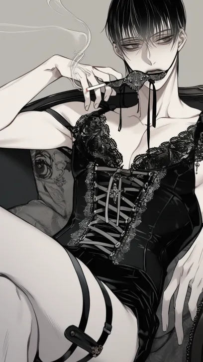 Midjourney Bot 更新时间:2026-03-09 00:06视觉系帅哥,黑白线画,日韩漫画,暖色调。清晰8K。黑色直发,黑眼睛,冷漠的眼睛,冷白皮,嘴唇浅色,帅气的男人,穿黑色紧身胸衣+蕾丝花边+十字交叉蕾丝花边缎带,骑士团化装舞会的面具为黑色,带有银色欧洲风格,嘴里叼着一根烟,翘着腿坐在沙发上 --ar 9:16 --style raw --stylize 180 --niji 6 --no no