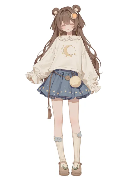 Midjourney Bot 更新时间:2026-03-09 00:07一位呆萌可爱的棕色长发美少女全身展示,白色纯色背景,现代日系日常服装设计,复杂有设计感,融入月亮元素,少女有着柔顺的棕色长发,齐刘海,两侧头发微微内扣,头顶扎着两个小丸子,用浅米色蝴蝶结发绳固定,头上别着一个银色小月牙发夹,上身穿着宽松的米白色棉质衬衫,衬衫是娃娃衫版型,领口有荷叶边装饰,袖子是泡泡袖,袖口收紧,衬衫胸前绣着一个浅黄色的弯月图案,周围有星星点点的刺绣小点,衬衫下摆不规则,前短后长,下身搭配高腰雾霾蓝色百褶短裙,裙褶是风琴褶设计,裙摆边缘有一圈银色细线绣成的星星和月亮图案,裙摆前侧有一个可拆卸的毛绒小球挂饰,小球上系着一个月牙形小牌子,腰间系着一条细的棕色编织腰带,腰带末端垂着两个小流苏,脚穿米白色中筒袜,袜口有浅蓝色和银色的小月亮图案,搭配浅棕色圆头玛丽珍鞋,鞋面上有一个金属小月亮装饰,人物呈灵动姿态,眼神迷茫可爱,嘴巴微微张开,棕色长发随着动作自然垂落,服装细节丰富,层次感强,清新日系风格,月亮元素突出,白色背景,全身展示 --ar 3:4 --stylize 100 --niji 7