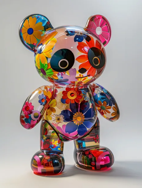 Midjourney Bot 更新时间:2026-03-09 00:08充满活力的熊猫潮玩雕塑,融合村上隆的超扁平艺术风格和冰墩墩的可爱圆润造型,采用鲜艳的多彩色调和透明外壳装饰,夸张的卡通花朵元素突显时尚酷感。全身视角在戏剧性光线效果下,虚幻引擎渲染技术展现高细节和动态构图。 --ar 3:4 --v 6.0 --style raw --stylize 220