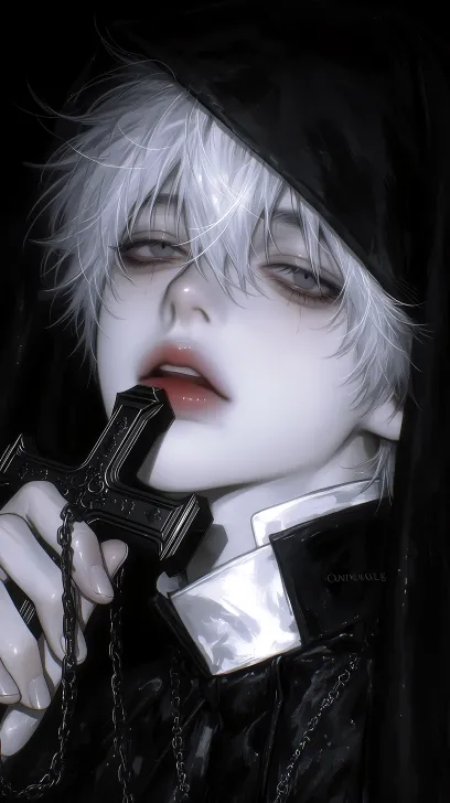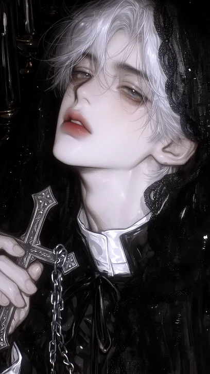 Midjourney Bot 更新时间:2026-03-09 00:10昏暗祭堂前,忧郁暗黑神父,青年男性,五官精致,冷白皮,眉尾微垂,墨灰色眼眸,眼睑半阖,视线低垂,纤长睫毛,根根分明,高挺鼻梁,薄唇紧闭,白色长发,中分,柔顺,合身哑光暗纹黑神父袍,白色立领神职领口,收袖口,同色细腰带,黑色半透纱披肩,手持缠锁链十字架,头微低,单手垂握十字架,身形挺拔,哥特祭堂,强烈明暗对比光影,低调暗调光影,昏暗氛围光,冷调微弱环境光,幽微烛火,强光影反差,局部侧光,柔和轮廓逆光,深邃阴影,低饱和暗调光影,面部柔和漫射光,彩绘玻璃透入的微弱圣光,黑色的蜡烛在燃烧,哥特暗黑电影感光影,高清光影渲染,脸部近景,厚涂,高清细腻,前景虚化, --ar 9:16 --c 32 --weird 187 --stylize 992 --niji 7 --profile i3e33d5 --no no