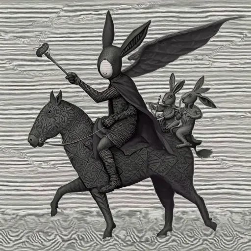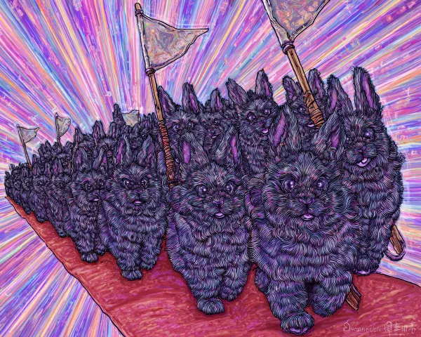 Midjourney Bot 更新时间:2026-03-08 00:12https://images.gogpt.vip/aigf/m_origin/20260307/2014480/m9lucea586umrobs.jpg https://images.gogpt.vip/aigf/m_origin/20260307/2014480/us42gd3gqjazx34n.jpg https://images.gogpt.vip/aigf/m_origin/20260307/2014480/4spo4mlr40qmx5sc.jpg https://images.gogpt.vip/aigf/m_origin/20260307/2014480/ccarx4qitwsvpbv8.jpg https://images.gogpt.vip/aigf/m_origin/20260307/2014480/6yxp01rros0o3wk4.jpg https://images.gogpt.vip/aigf/m_origin/20260307/2014480/aevrqf0ahnuerhut.jpg 主体:背后带黑色翅膀的男孩骑着马准备出征 元素:兔子欢送仪仗队,包括兔子拉小提琴、兔子吹号、兔子打鼓、兔子敲锣 风格:怪诞色彩 注意兔子形象参照所提供的垫图中的兔子形象,但是要增加色彩,不要黑白素描,需要彩色丙烯画呈现 --ar 1:1 --v 7 --c 6 --weird 1 --stylize 107 --sref https://images.gogpt.vip/aigf/m_origin/20260307/2014480/m9lucea586umrobs.jpg --oref https://images.gogpt.vip/aigf/m_origin/20260307/2014480/6yxp01rros0o3wk4.jpg --ow 29 --sw 108
