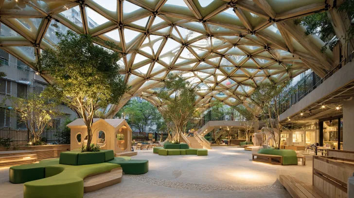 Midjourney Bot 更新时间:2026-03-08 00:13帮我根据生成一个户外交互装置,要求外形上有纺织相关的抽象化元素,为全年龄段皆可以使用的一个休闲区域,不论小孩或是成人都可以在里面休息,有孩子可以穿梭玩耍的空间,也有成人可以用以休憩的地方,有一定低矮景观装置进行装饰,比较明亮一些,装置与周边环境产生一定关系,可以带一点几何图形以及地铺设计,简洁一些,包括可以蔓延到地铺,材质上光滑一些,造型上连贯一点,可以有几个空间的穿插感,有一些排列整齐的线性的镂空 --ar 16:9 --v 7 --style raw --stylize 195