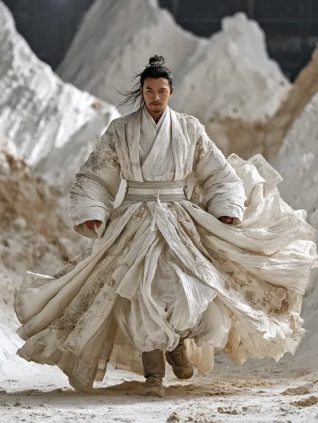 Midjourney Bot 更新时间:2026-03-08 00:13一个古风男子,穿着月白色的宽袍大袖在月光下张开双臂,背影 风吹起衣服,头戴发簪,脚下是山路,山下是一片繁华的古代城市夜景。边缘虚化,强曝光,人像拖影,抽帧感,饱和色彩影棚滤镜,超现实主义电影质感 近景 --ar 3:4 --v 7 --c 2 --weird 2 --stylize 262