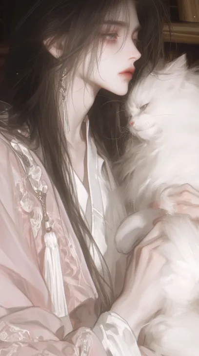 Midjourney Bot 更新时间:2026-03-08 00:13高清渲染,室内场景,古风室内房间,古风美男子坐在旧藤椅上,长头发洁白透明且柔顺,发丝纹理清晰,肌肤呈哑光雪白色,鼻子如半透明瓷器般精致,五官柔和细腻。他穿着粉色汉服带有精致刺绣的立领中式套装,怀中抱着一只猫,望着窗外,柔和的阳光洒进室内,宛如优雅现代的高贵绅士。 --ar 9:16 --style raw --stylize 1000 --niji 6 --profile xgsftjj stfbdsp 4iz7b6u qcmbaiw