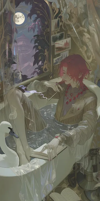 Midjourney Bot 更新时间:2026-03-08 00:14商业插画渲染,二次元塔罗风格,神秘主义元素,中世纪花纹装饰,马戏团元素装饰,月亮元素,一个躺在浴缸里光着脚的红色长发女子,红色的长发遮住一只眼睛,手里拿着烟斗,透明的薄纱,丝绸的服装,红色的珠宝项链,五个手指戴着宝石指环,光着脚,右手翻着书本,窗户外皎洁的月光,浴缸里有黑天鹅,旁边有留声机,墙壁上贴着马戏团的相片, --ar 1:2 --stylize 211 --niji 7 --sref https://images.gogpt.vip/aigf/m_origin/20260220/140639/t73j9suxwfzhv3qk.png https://images.gogpt.vip/aigf/m_origin/20260220/140639/a7ou9sr36eidfrxe.png https://images.gogpt.vip/aigf/m_origin/20260220/140639/7k3f07puturs1vrr.png --sw 357