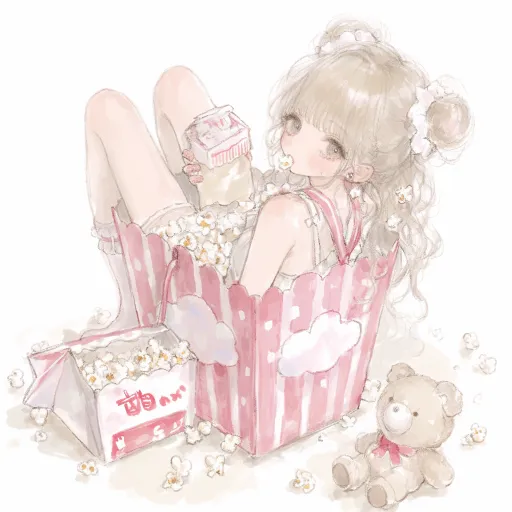 Midjourney Bot 更新时间:2026-03-08 00:15俯视视角,正面镜头角度,七分身拍摄,一个女生坐在一个爆米花桶里,淡黄色丸子头发型,身穿粉白色背带裤,云朵印花,手里拿着爆米花,旁边有一只小熊玩偶,地上有许多玉米粒,适当缩小人物,墨渲染,精致细节,柔和的光线,氛围感,朦胧感 --ar 1:1 --seed 3627277985 --stylize 555 --niji 6 --sref https://images.gogpt.vip/aigf/m_origin/20250427/1512125/ngiqkg9co3roj2p8.png --profile rsxjf9z --no 不要出现花篮